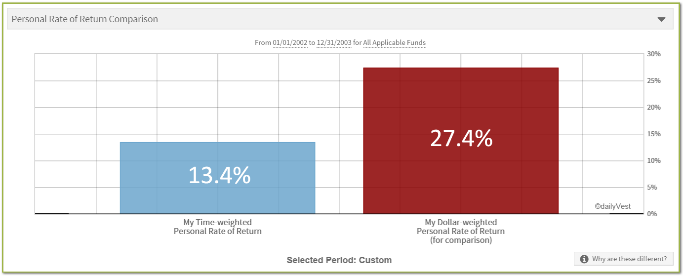 The next chart which also uses dailyVest's PIP module calculates both a TWRR and DWRR for the entire 2 year period...