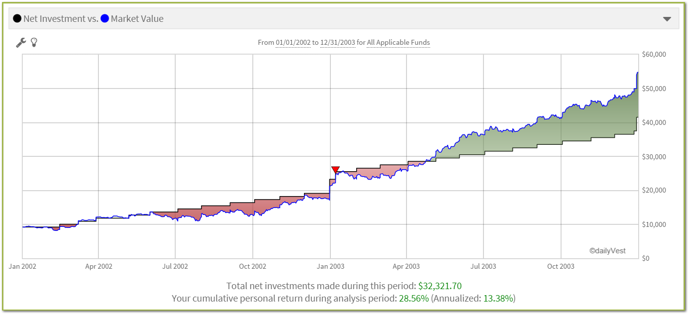 The chart below uses dailyVest's Personal Investment Performance (PIP) module to show the investor's net investments (cashflows) relative to the changing market value of those investments over a two year period.