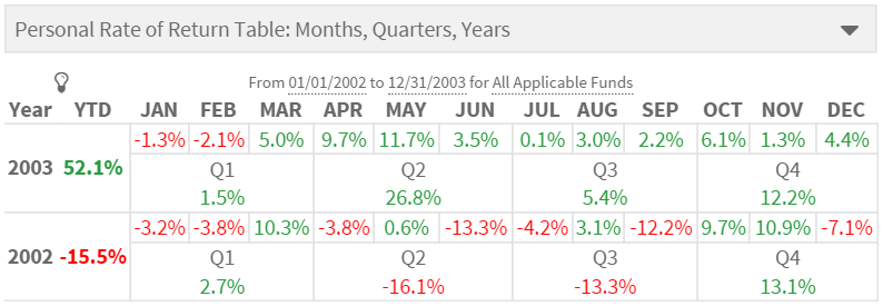 First, some observations about the investment activity shown in the net investment vs. market value line chart above. It looks like 2002 was a relatively bad year in terms of this investor's holdings -- June and September 2002 were especiall bad while 2003 was a generally good year. Notice there are no extreme cashflows over the 2-year period, just 24 regular monthly contributions. So if there are no extreme cashflows, then for short monthly time periods there should not be significant differences in the calculated monthly returns for each of the two methods. You can see this in the next two tables of monthly returns calculated using the TWRR and DWRR methods. (These analytics are also available in the PIP module.) As can be seen all the monthly returns are nearly the same between the two methods...