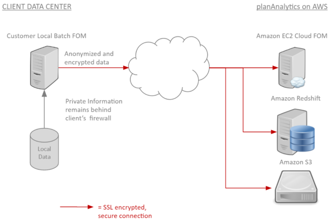 planAnalytics uses an extremely powerful and secure cloud-based architecture. Key data is gathered by a batch processing and data anonymization module which resides within your data center and behind your firewall. It is then stripped of private information such as names, employee IDs, etc., ('PI') and sent to the FOM calculation engine residing in an Amazon Web Services cloud ('AWS'). Processing and calculations occur in the cloud in realtime and are returned to your web application where it is re-combined with the stored PI and presented within your plan sponsor portal's web application.