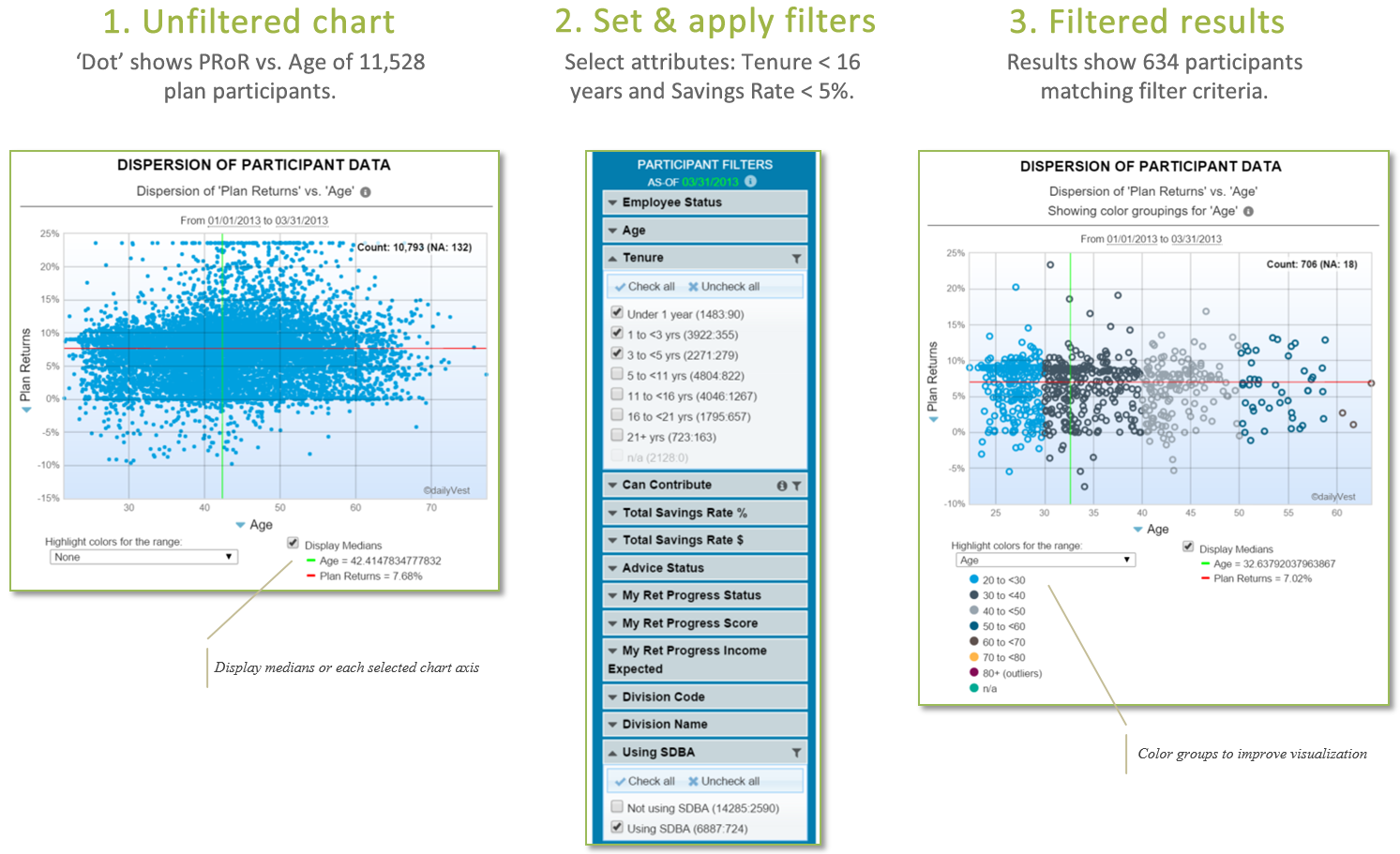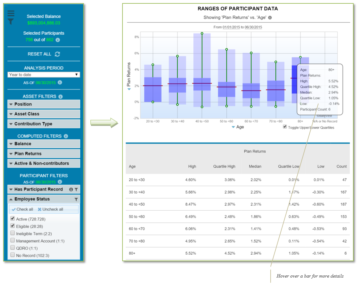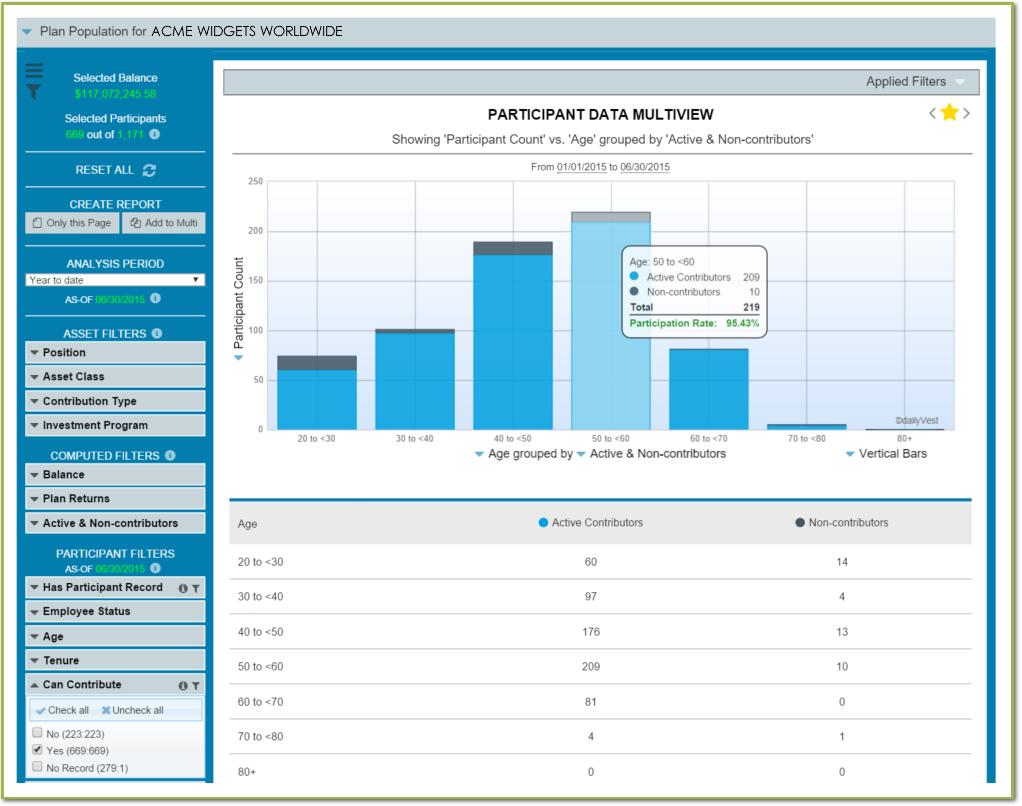 Filtering is available on almost all screens and allows you to analyze only those plan participants with specific investment or participation criteria you are looking for.